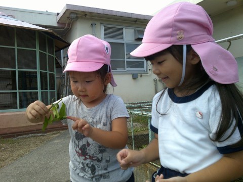 登園してくるなり、「アオムシくんの葉っぱが元気ないねん、新しい葉っぱ入れあげなあかんねん・・・。」と話す姿がありました。よくよく話を聞いてみると、昨日、見つけたアオムシをおうちに持って帰って葉っぱを食べている様子を見ることを楽しんでいたのですが、朝になったら葉っぱを食べていなかったようで、“新鮮な葉っぱだったら食べてくれるかも!”と思いついたようです。葉っぱをとりに行くと、またまたアオムシを発見!!子どもたちは大喜びです。新しい葉っぱを入れてあげると、また葉っぱを食べるようになったアオムシを見て、「やっぱり新しい葉っぱがいいんや!!」とつぶやいていましたよ。生き物の動きを観察しながら、「なんでかな?」「どうしたらいいかな?」と考えようとするもも組さん。1学期に体験したことが、今につながり、自分で考えようとする姿が見られるようになってきてうれしく思います(*^▽^*)