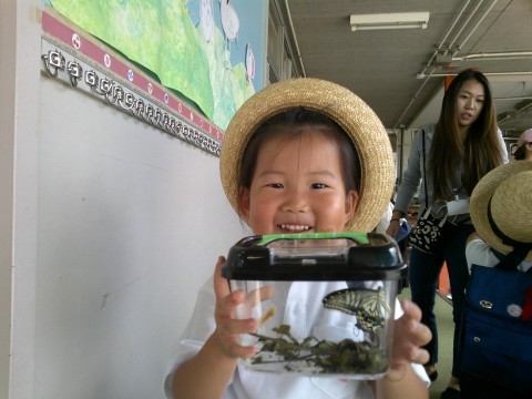 先日から、毎日お世話を続けていたアオムシがサナギになり、ついにアゲハチョウが羽化しました。「チョウになってる!」ととてもうれしそうで、みんなで飼育ケースの中のチョウを見ました。その後、ケースの蓋を開けると、元気にチョウが飛び「とんだ~!!」「バイバ~イ!」と大騒ぎでしたよ。また、園庭で元気に飛んでいるチョウと出会えたらいいね。