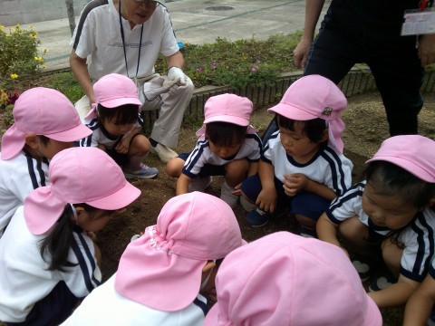 カブトムシの幼虫をおうちから持ってきてくれたお友達がいて、みんな興味津々でお世話をしています。土の掃除をしたり湿らせたりしながら、幼虫のが土にもぐっていく様子を見て楽しんでいましたよ。