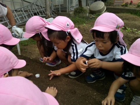 畑には、大根の種をまきました。小さい種を見て、「ちっちゃいなあ」「かわいいなあ」ともも組さん。お世話をしていたら、大根ができることを伝えましたがみんな半信半疑な様子でした。世話をしながら、大根の生長を見ながら、作物ができる様子に興味をもってほしいと願っています。もも組さん、おいしい大根ができるようにお世話をがんばろうね♪