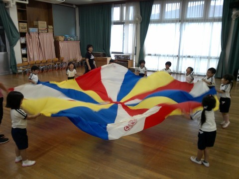 降園前には、保育室にトンボが迷い込んできて、大騒ぎ!「めっちゃおおきいなあ」「からだ、みどりいろやわ」「(翅は透明や~」などと、トンボを観察していて、間近で見れるとても貴重な機会でしたよ。虫捕り網を使って戸外に戻してあげました。