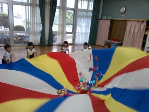 遊戯室では、バルーンで遊びました。初めてバルーンをさわったもも組さん。遊んでみるととても楽しかったようで、あっという間ににっこり笑顔になりましたよ。たんぽぽ組さん、すみれ組さんと一緒にすることを楽しみにしていました。