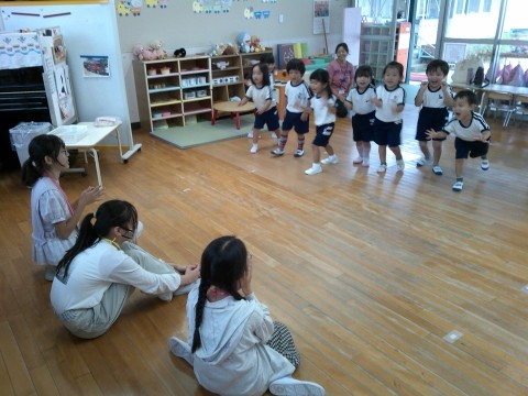 森のお散歩ごっこでは、いろいろな動物のまねっこをしながら、体の動かし方がどんどんしなやかになってきています。友達や先生と一緒に園庭で体を動かすことを楽しんだ後は、たんぽぽ組さんやすみれ組さんの様子を見せてもらいました。「恐竜、かっこいいなあ」「すみれ組さんすごいなあ」などと、つぶやく様子も見られます。年上の友達からもらう刺激がたっぷりなようですよ。