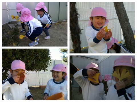 今日も、朝のかけあしの後、戸外で遊びました。昨日、強い風が吹いていたのでたくさんの落ち葉がありました。それに気づいたもも組さんは、「黄色い葉っぱがいっぱい!」ととても嬉しそう。手で持ちきれなくなると、バケツを持ってきてたくさん集めていましたよ。「この葉っぱ、大きいで!」と、子どもたちの顔が隠れるほど大きい葉っぱもありました。集めているうちに、「“パー”みたい」「こっちは“チョキ”!」などと形の違いに気付いて喜ぶ姿もありました。おうちでごちそうをつくっている子どもたちと遊びが混ざり合う姿もありました。ススキのような形の葉っぱを見つけると、おそうじごっこをする姿もありましたよ。身近なものを遊びに取り入れながら遊ぶことを楽しみました。