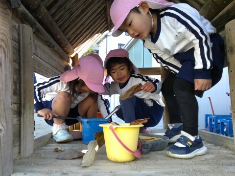 昨日は雨だったので、今日は戸外で遊べてとても嬉しそうなもも組さん。最近のお気に入りの場所は、“砂場”の子どもたちが多く、落ち葉をワカメに見立ててみそ汁づくりをしたり、大きなフライパンにドングリや葉っぱを入れて音を楽しみながらお料理をする姿もありました。大きなシャベルを使って山をつくり始めた子どもたちは、昨日の雨で湿気ているので、山をつくりやすく、どんどん大きな山ができていきました。その様子を見ていた他の遊びをしていた子どもたちも楽しそうな雰囲気に誘われて、どんどん一緒に遊ぶ友達が増えていきました。