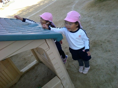 カプラでは、友達と一緒におうちをつくることが楽しいようで、「ここは私のおうち~」「○○ちゃんの横は私のおうち~」などと話したり、「わたしのおうちはマンションやから高いねん」と高く積み上げることを楽しんだりする姿もありました。戸外では、雲梯のぶら下がりや雲梯渡りに友達と一緒にチャレンジすることを楽しんでいます。さまざまな場面で友達関わることの楽しさを感じる場面が見られます。自分の思いを表出できるようになってきたからこそ、友達と思いが違って困ってしまうこともありますが、でもやっぱり“友達が大好き!!”なもも組さん。友達との関わりを楽しみながら、一人一人の思いを大切にしていきたいと思います。