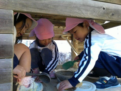 昨日つくった砂山づくりの続きが始まりました。大きな山になるように一生懸命ショベルで掘っていると、「トンネルつくりたいねん」「地下鉄みたいにしたい!」という話が出てきて、トンネルづくりが始まりました。何度かトンネルが崩れてしまって、「上を掘ったらあかんで」「下を掘ってな」と気づいたことを友達や先生に伝えていましたよ。やっとトンネルがつながると、「やったー!電車が通れた~」と大喜び。また違う場所にトンネルを掘っていきました。おうちでは、おうちごっこの役になって「お買い物にいってきま~す」「赤ちゃんはここで待ってる」などのやり取りを楽しんだり、サラ砂を使ってごちそうをつくったりしていました。友達と一緒に遊ぶって楽しいね♪