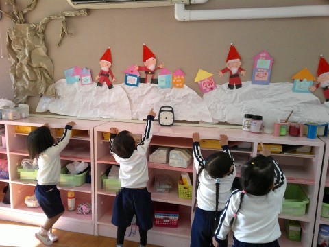 もちつきの後は、保育室で好きな遊びを楽しみました。戸外で遊ぶことも楽しいけれど、保育室では先日から車ごっこや赤ちゃんのお世話ごっこがとても楽しくなってきて、今日も友達と関わりながら遊びが広がっていきましたよ。