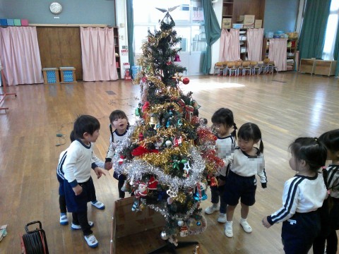 保育室では、昨日つくったサンタさんが壁面に飾られていることに気づき、自分のつくったサンタさんを探したり、友達のサンタさんを見たりして楽しみました。その後は、ジングルベルの曲に合わせて、ふれあいダンス♪先日は、すみれ組さんと一緒にしましたが、今日はクラスの友達と一緒に踊ることを楽しみましたよ。踊ってわくわくした後は、すみれ組さんが飾ってくれたツリーを遊戯室に見に行きました。「サンタさんがいるで!」「こっちにも~!」「サンタさんいっぱいいる~」と大喜びでした(*^▽^*)