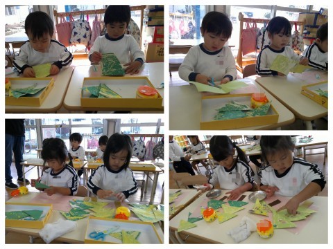 保育室では、先日ドングリを転がしてきれいな模様ができた画用紙を使って、ツリーをつくりました。四角形の画用紙を三角形になるように切ってつなげてツリーをつくりました。たくさんつくったり、たくさんつなげて背の高いツリーをつくったり・・・。ツリーができると、飾りをつけることを楽しみました。形や色にこだわったり、飾り方を工夫したりとかわいいツリーがたくさんできあがりましたよ。のりやボンド、どちらの接着剤を使えばよいかも自分で考えてつくっていましたよ。もも組の保育室の壁面がとてもにぎやかになりましたよ♪お迎えに来られた時にお子さまと一緒に見てくださいね。