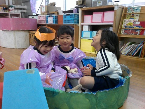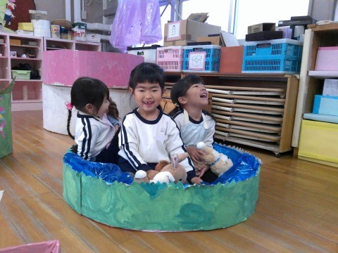 遊戯室では、こりす組さんに劇遊びを見てもらいましたよ。やっぱり、お客さんが見てくれることがうれしく、みんなとてもいきいきと楽しくおはなしごっこを楽しみました。おはなしごっこが終わった途端、「どうだった?」「たのしかった?」と見てくれたこりす組さんに尋ねるほどでした(*^▽^*)おうちの人に見てもらったうれしさや「がんばってたね!」とほめてもらった体験から、こりす組さんにも感想を聞いてみたいという気持ちになったのでしょうね♪「楽しかったよ」と言ってもらえて満足そうなもも組さんでした。