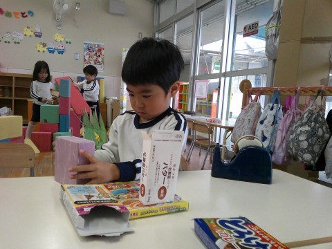 その後は、段ボール箱を使って、ボール転がしゲームをつくりましたよ。いろいろな遊び方を見つけて遊びました♪