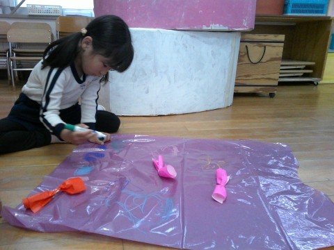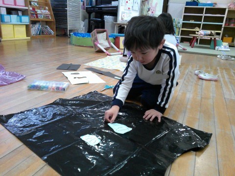 今日も好きな遊びを存分に楽しみました。砂場では、工事ごっこが継続しています。遊んでいるうちに自分のイメージが広がったり、友達とイメージがつながったりすることが楽しいようですよ。プリンセスごっこしている子どもたちは、ドレスが欲しくなって自分でつくってみることにしましたよ。つくったり身につけたりすることがとても楽しいようでした。