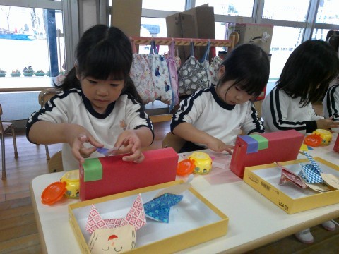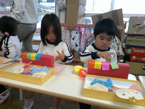 その後は、みんなでおひなさまづくりの続きをしました。折り紙をのりで接着し、おひなさまを飾る台をつくりました。できた台に早速飾ってとてもうれしそうでしたよ(*^▽^*)おうちのみなさん、週末に持ち帰りますので、お楽しみに♪