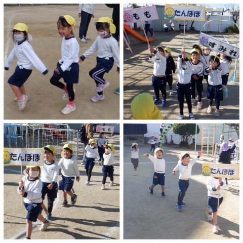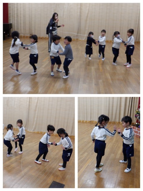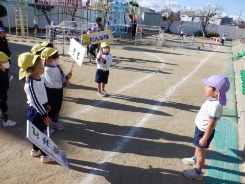 楽しみにしていた『おもちつき』がありました。地域の方が最初についてくれているのを見ていると、ペッタンペッタンといい音が聞こえてきます。「あれ(杵)重そうやな~」「じいじ、がんばれ~!!」とお友達のおじいちゃんを応援する姿もありました。できあがったおもちを見せてもらうと、「おいしそう!」「ぴかぴかしてる♪」とますますもちつきが楽しみに♪