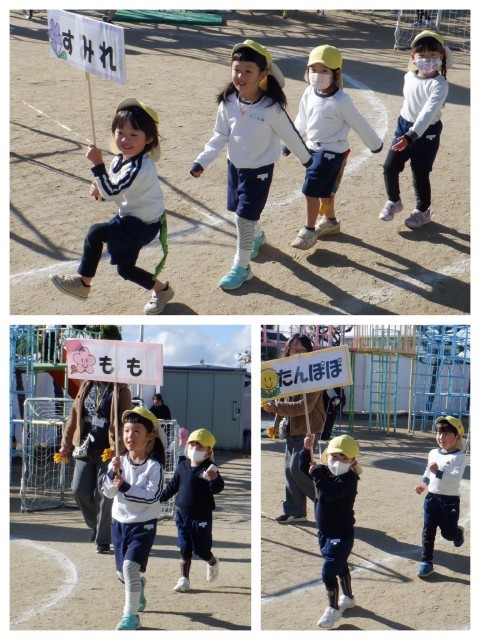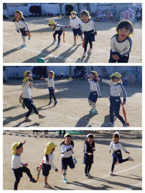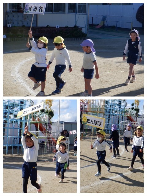 昨日から始まった駆け足の後、そのまま自発活動時に行進曲をかけていると、運動会を思い出した子ども達が『行進ごっこ』を始めました。音楽に合わせて友達と一緒に入場行進をして喜んでいます。そこに今日は「プラカード欲しい!」と運動会の時に年長さんがもっていた憧れのプラカードを持ちたいと言いに来ました。プラカードを渡すと大喜び♪張り切って入場を始めました。とっても上手でまるで年長さんみたい♪そこへすみれ組さんがやってきて、「プラカードを顔の前で持ったら、顔見えなくなるから上にあげた方がいいよ!」とアドバイス☆入場してからも「すみれ組はここから入ってここに並ぶよ」と気にして教えてくれていました。おかげでどんどん上達!自信満々で入場行進を楽しんでいました。その後はかけっこしたり、恐竜ダンスをしたりして運動会を再び楽しんでいました。来年の運動会が楽しみです☆