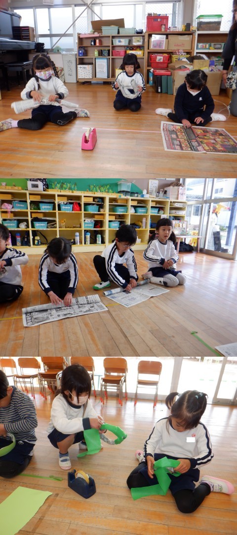 新聞紙でクリスマスリースをつくりました。新聞紙を巻くのは簡単でしたが、リースに不織布や画用紙を巻くのに少し苦戦しました…。だけど、最後まで根気よく巻きつけて完成☆明日は飾りつけを楽しみます。