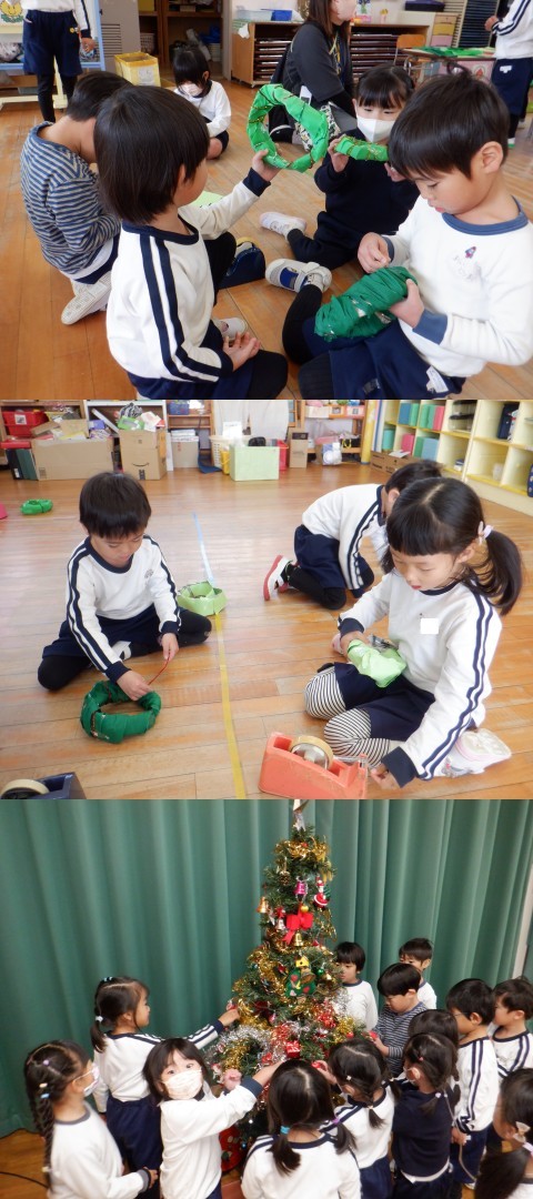 リースづくりの後は、年長さんが飾り付けてくれたクリスマスツリーを見に行きました。飾りがいーっぱいで大喜び♪サンタさんやプレゼントを見つけて楽しんでいました。電気を消すとキラキラ光ってより一層きれい🎄クリスマスが待ち遠しいね。ツリーを見た後は、ジングルベルの曲に合わせてみんなでダンス♪右手と左手わかったかな?
