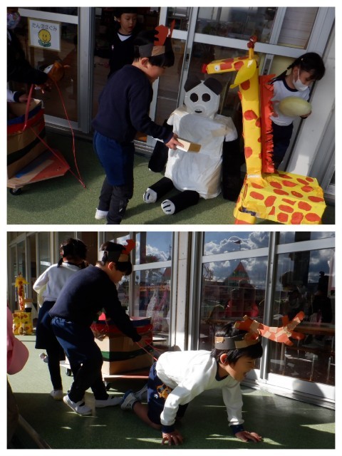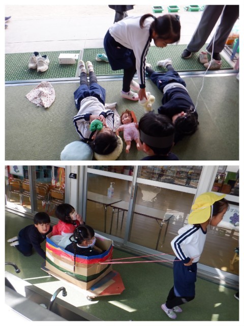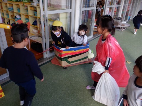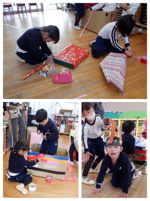 クリスマスツリーを見たからか、午後からの自発活動では「ソリつくる~!」と友達と一緒にそりづくり♪ソリができると、もちろんサンタの服が欲しくなり、ソリをひくトナカイさんが必要です。必要なものを次々とつくるところがさすがたんぽぽ組さん!プレゼントもたくさん積んで、テラスで寝ている友達や動物、出会った先生たちに配っていました。サンタごっこが繰り広げられる楽しい午後の自発活動でした🎅