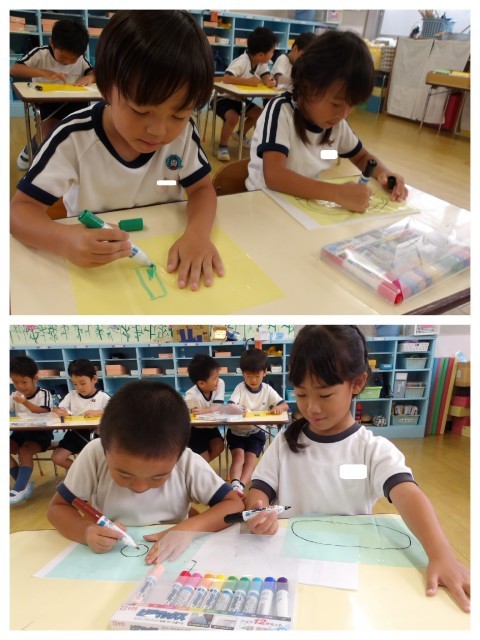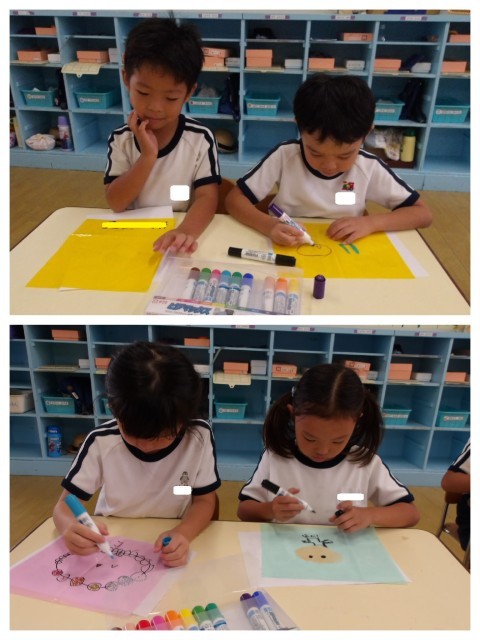 運動会の日に飾る子ども達の万国旗の絵を描きました。運動会で頑張っていることや自分の好きなところを、一人2枚描いています。先週、1枚目を描いていたので今日は2枚目の旗の絵を描きましたが、係の仕事をしているところやチャレンジ、リレー、フラッグ等、それぞれの思いが詰まった旗ができました。「お客さんも描こうかな!」と、当日の様子を思い浮かべながら描いている姿もありました(^^)
