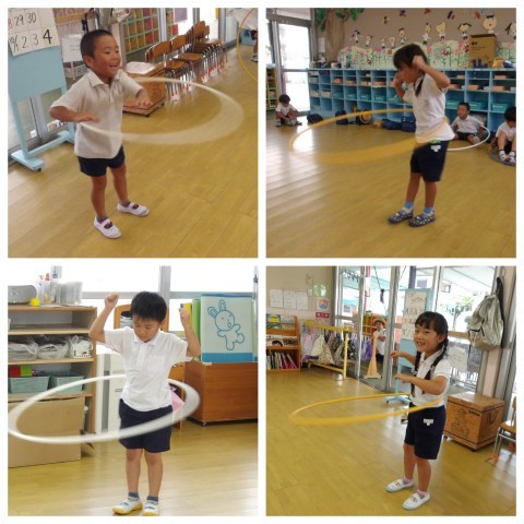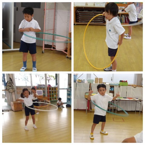 降園前にはみんなでフラフープの見せ合いっこ☆いつの間にやら、とっても長い時間回したり2本、3本と挑戦したりしているお友達が随分と増えました。子ども達の自信も深まってきたように感じます(^^)
