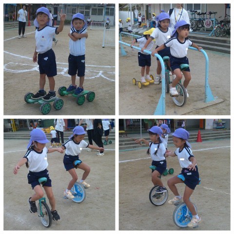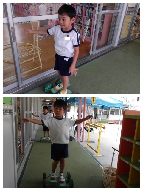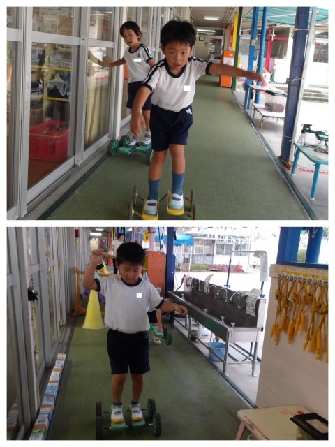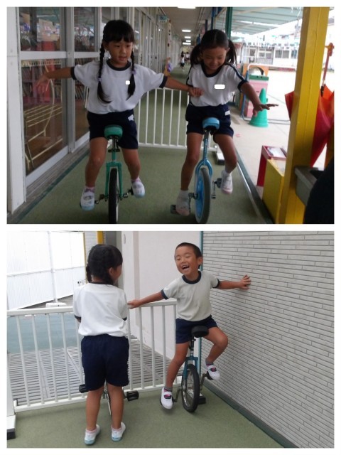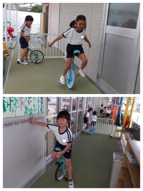 今日は園庭が雨でつかえなかったので、一輪車やバランスカーに挑戦している子ども達は廊下をつかって練習しました。