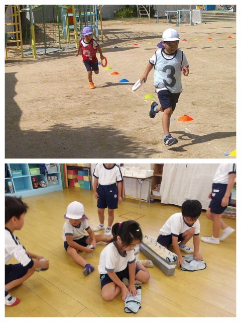 9月も今日で終わりです。運動会の日のお天気を子ども達も気にしているようで、「晴れに変わってたで!」とみんなで話し合っています。午前中はお部屋の中で司会や係を確認しながらみんなでやってみたり、一回勝負でリレーをしました!リレーを始める前の準備や片付け、当日は運動会係のお家の人にお手伝いをしてもらいますが、クラスでする時には子ども達がどんどん用意をして進めてくれています☆必要なことを自分達で考えて、声を掛け合って進める姿がとっても頼もしく感じます!(^^)!ビブスも綺麗に畳んで片付けていますよ☆
