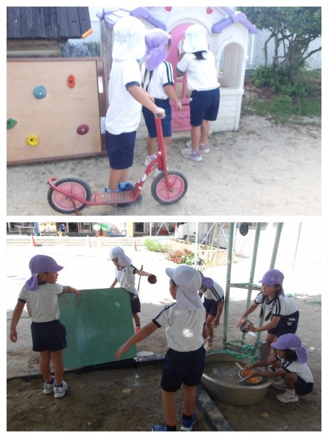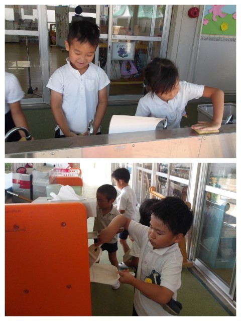 好きな遊びでホッと一息(^^)頑張る時と思いっきり遊ぶ時と、どちらも子ども達にとって大切な時間です。片付けの時間には自分たちが遊んでいない砂場にも集まって、最後まできれいに片付けてくれました☆クラスの掃除も大好きな子ども達です。