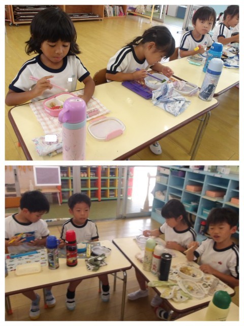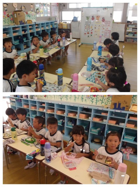 お弁当の時間にはホワイトボードを見ながら、「今日の中身に3つのグループは入っているかな?」と確認しながら食べました。