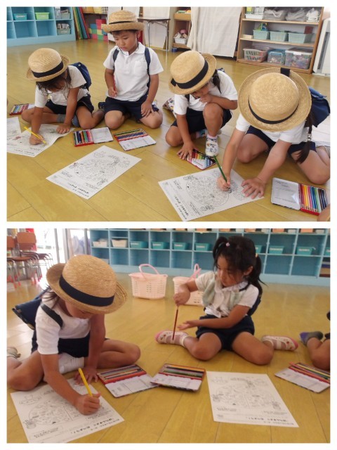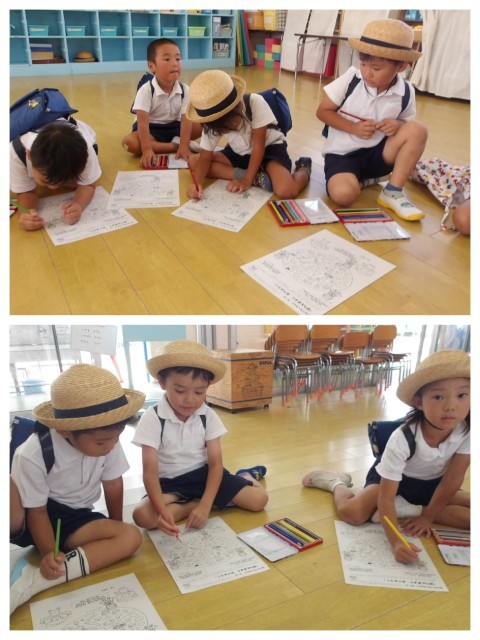 今日は帰る前に「あか・きいろ・みどり」のレンジャーの色を色鉛筆で塗りました。