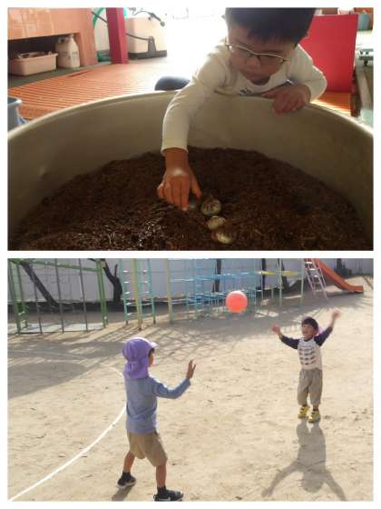 雨上がりの園庭で、泥遊びを存分に楽しんでいました。