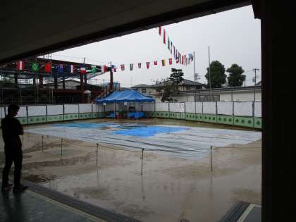 急な多量の雨により短い時間で園庭の状態が非常に悪くなりましたので、中止の判断をしました。連絡が遅くなりましたことお詫び申し上げます。