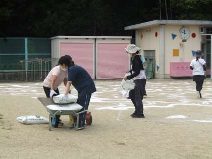 先生たちみんなで,園庭に”にがり”を撒く作業をしました。