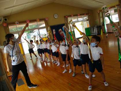 遊戯室でバトンを踊っていると「なんか頑張ってるやん!見せてほしいな〜。」と先生たちが様子を見に来てくれました。すると「めっちゃ頑張ってるから見て見て!!」と大張り切り。曲が始める前から真剣な表情です。バトンをどんなふうに動かすと素敵に見えるかがだんだんわかってきたようで意識しながら演技したり曲や友達とも合わせるということが少しずつ感じられるようになってきつつあります。これからの子どもたちの成長が楽しみです。
