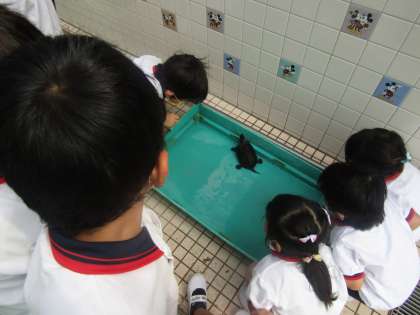 いつもお部屋のお隣にいる「かめ」のことが,気になっているうさぎぐみの子どもたち。