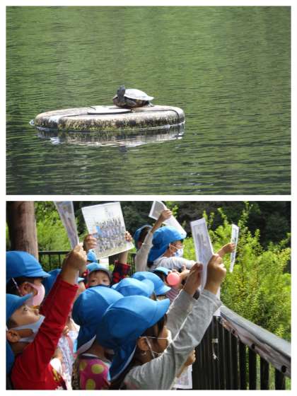 かめじろうと約束をしていた運動会のがんばりパワーを見せに行きました。公園に着くと「待っていたよ!」とばかりにかめじろうがこちらを見ていました!子どもたちは大興奮!!「かめじろう〜」「パワーたまったよ!」「元気だった〜?」などパワーの玉や運動会で頑張った自分たちの写真を見せながら話しかけていました。