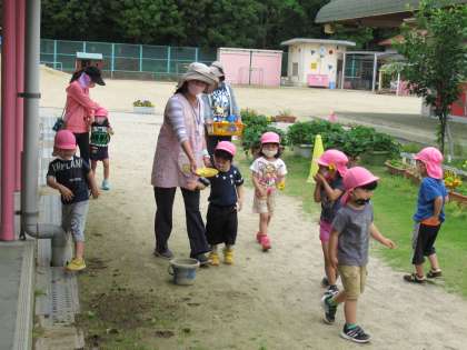 今日の自発遊びの時に,「いいの,見つけたよ!」と一人の子が言いました。「なになに?」とみんなで駆け寄ってみると,プランターを動かして見せてくれました。そこにはミミズが!! 「わあ!」と声をあげる子どもたち。ミミズをじっくり見ることが初めての子もいます。「かわいいね」「動いてるよ!」「どこに行くんやろう?」集まった子ども達の中には虫が苦手だった子も興味をもってみていました。「お部屋にもっていこう」と皿にいれたら,「行こう 行こう!」と喜ぶ子ども達。廊下でじっくりと見ていたら,「どっちが目かな?」と考えだした子がいました。「図鑑もってきてあげるよ」と先生が言うと「やった!」と喜んで,一生懸命図鑑の中から探そうとしていました。「名前はミーちゃんにしよう」「でも,おうちに帰してあげないとかわいそう」というので部屋の前の花壇に帰すことにしました。「また遊ぼうね〜」ミーちゃんのおかげでミミズが大好きになった子ども達でした。
