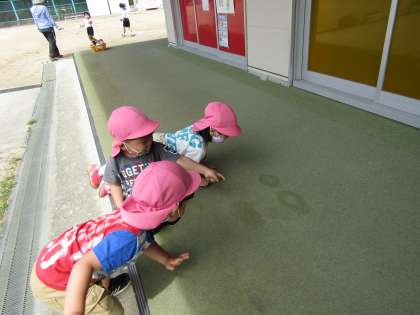 虫眼鏡が気に入った子ども達。いつの間にか「探偵ごっこ」が流行りだしました。「この足跡はだれだ!?」「泥棒か!?」「その足跡は僕でした〜」「なーんだ 笑」「ほんとだ!靴の裏の模様が一緒だ!」と虫眼鏡で見て確認したり,「この水の跡は,顔に見えるぞ!」「ほんとだ!」などなど,探偵気分で園内を探索している子ども達でした💛