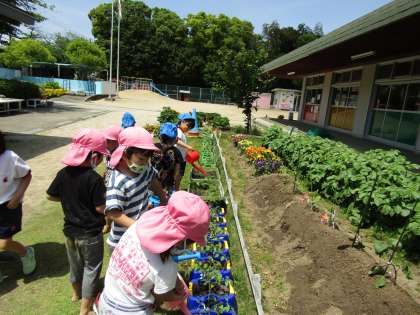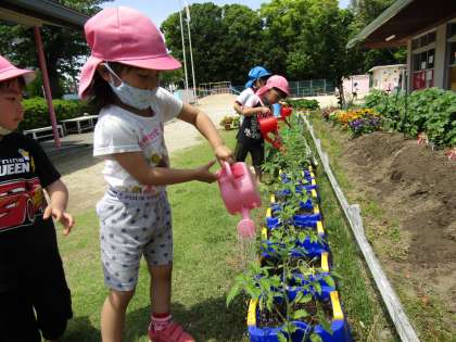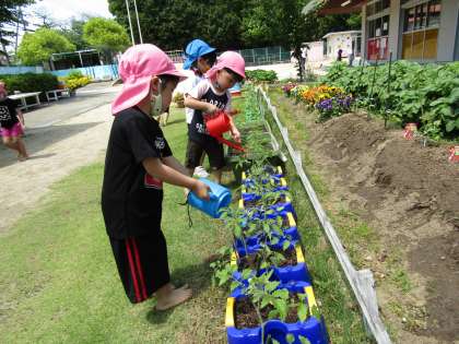 先日植えたミニトマトの水をあげました🍅 校務支援員さんに添え木をしてもらいましたよ。