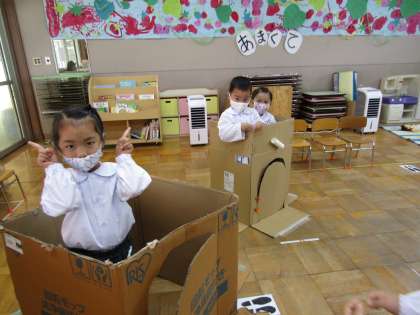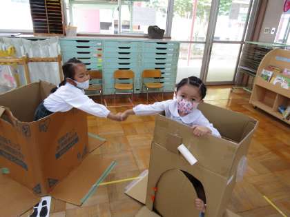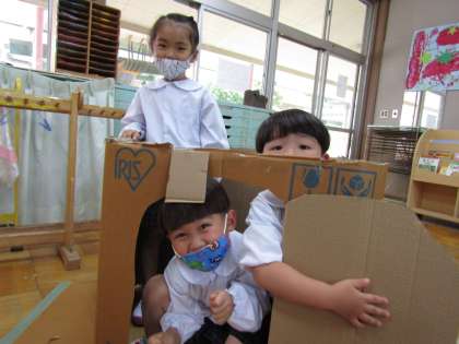 昨日の段ボール遊びが楽しかったようで,今日は朝からおうちの人も,たくさんの廃材を持ってきてくれました。昼食が終わると,「段ボールで遊ぼう!」とさっそく遊びに取り掛かる子ども達。「おうちをもう一つ作って」と言ってきたので,もう一軒建ちました。「手をつなげるね♪」「玄関のピンポーンがいるわ」と段ボールを小さく切って,チャイムもつけていました。「ピンポーン」「いらっしゃーい!」と何度も繰り返して遊んでいましたよ。