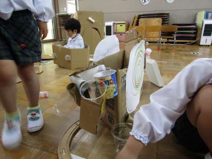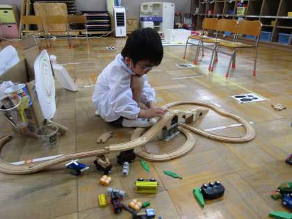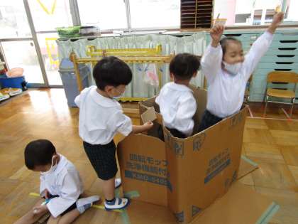 電車好きの子は,毎日遊びこんでいるので線路をつなげるのが上手になってきました。高架をかけると段差ができて,電車が走りにくくなるのですが,高さを合わせてスムーズに走れるように工夫していました!技が巧みになってきましたよ。車好きの子達は廃材を使ってどんどんと段ボール車を改造していきます。「ここには,冷たいお菓子を入れるポケットがついてるの」と車のフロントにお菓子入れもついているそうです♪おうちつくりの子ども達の中に,「ピンポーン」と新しいお客さんがやってきて,段ボールの四角い切れ端をいくつか持ってきてくれました。「それはなあに?」ときくと「これはクッキーです。どうぞ」なんと手土産を持って遊びに来てくれましたよ💛