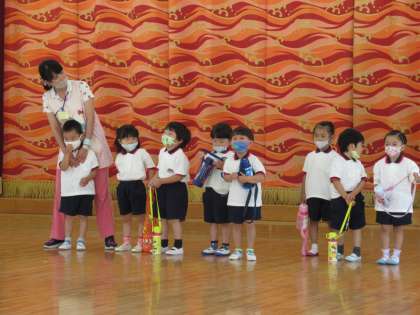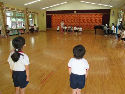 昼食の用意をしていたら,遊戯室から元気な歌声が聞こえてきました。「年長さんや!」「歌ってるね,聞かせてもらおう!」と遊戯室にお邪魔しました。子どもたちは,年長さんの歌声を聞かせてもらって「かっこいい」と言っていました。お礼にうさぎ組も得意の「チューリップ」を聞いてもらいました。たくさんのお客さんの前でも,緊張しながらがんばって歌っていましたよ♪