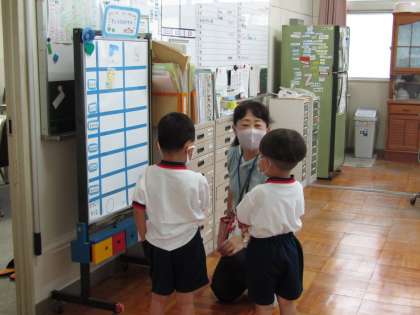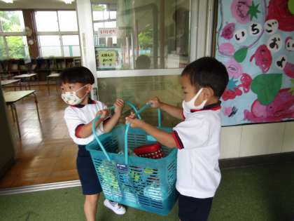 今日は,うさぎ組で初めての当番としました。お仕事はたくさんあります。お休み調べに,職員室への欠席伝言,お弁当を涼しい部屋への運搬する,健康カードを配るなどなど,たくさんのお仕事がありますが,一生懸命取り組んでくれました。そんな彼らを友達は「あんなことするのかぁ。すごいなあ」と羨望のまなざしで見ていましたよ☆