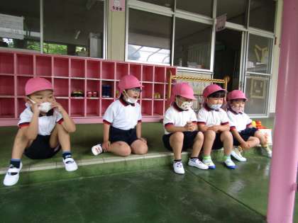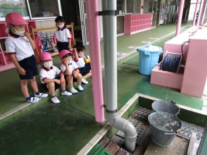 今日はあいにくの雨,屋根からつたう雨をバケツでうけてみると,不思議な音が・・・「ポンポンって音がするね」「バケツひっくりかえしたら,バンバンに変わった!」と雨音の違い,はねる雨をじっと見ていました。子ども達は雨の日も楽しいみたいですよ♪