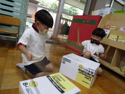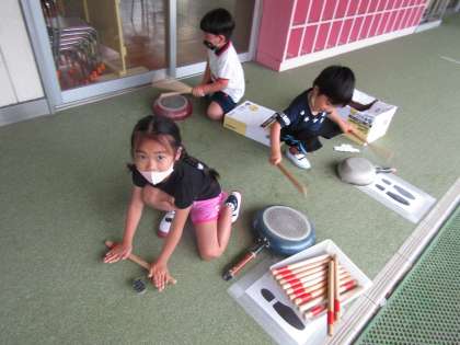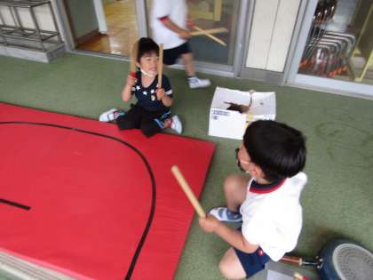 昨日からリズム打ちを楽しんでいる子ども達。今日も朝から「たいこしたい!」と言っていました。いつも砂場で使っているフライパンを叩いてみたり,マットを叩いて遊んでいました。「この音,おもしろい!」「音楽かけて!パイナポー体操がいいわ!」とリクエストしてきましたよ。曲の最後の締めもみんなでアドリブで「チャ チャチャン♪」としっかり合わせるから,感心しました☆