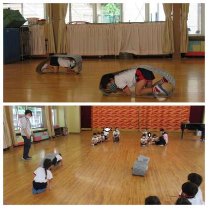 昨日作ったダンゴムシキャタピラーを使って「ダンゴ虫競争」をしました(^▽^)/みんな速く進むコツがわかってきたようで白熱した競争になっていました!