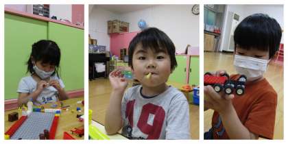 今日は雨…。お外には行けなかったのですが、お部屋でそれぞれ好きな遊びを楽しみました。おやつもペロリと食べましたよ!
