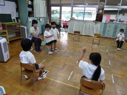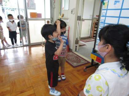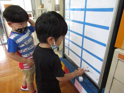 今日のお当番です。お友達の名前も少しずつ覚えてきています。苗字を言うのは難しいようですが,がんばっていますよ!職員室でも,二人を友達が見守っています。