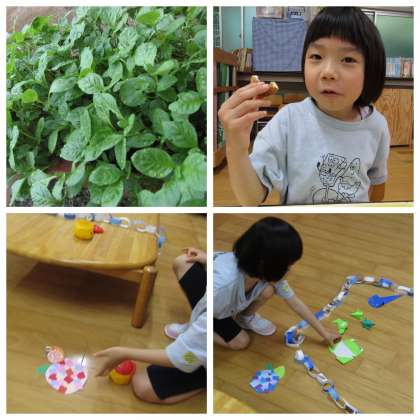 今日もお外で遊べず残念でしたが、折り紙でお池を作り、その中でカエルを泳がせてあげたり、あじさいの花にカタツムリをのせてあげたりして遊びましたよ。