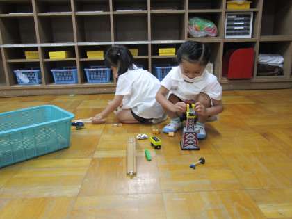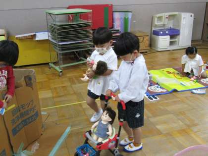 昼からの室内自発では,赤ちゃんを抱っこして「ぼくはお父さん」「ぼくはお母さん」とミルクをあげながら仲良くお散歩していたり,線路を組み立てて遊んだり,段ボールのおうちを作り変えて遊んでいました。